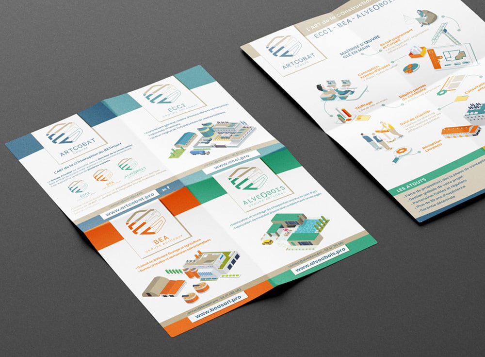- Conception de plaquettes, fiches chantiers, catalogues et brochures commerciales
